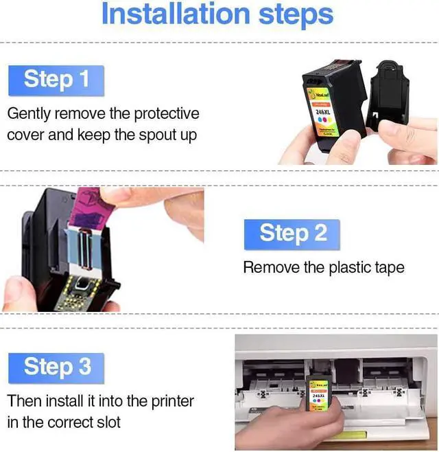2. Please remove the black or transparent protective cover and pull off plastic tape before install these cartridges. (DON'T TOUCH THE CHIP)