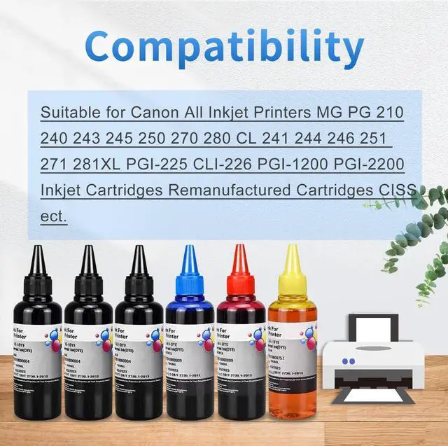 You Can Receive: 6-Pack 100ml bottle of refill ink dye ink for Canon 250 251 270 271 280 281 1200 2200 PG240 CL241 PG245 CL246 PG210 (3 Black, 1 Cyan. 1 Magenta, 1 Yellow), with syringe and needle.