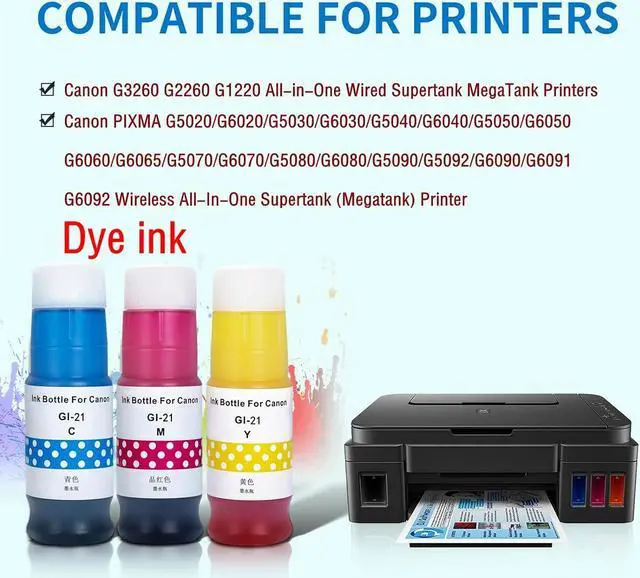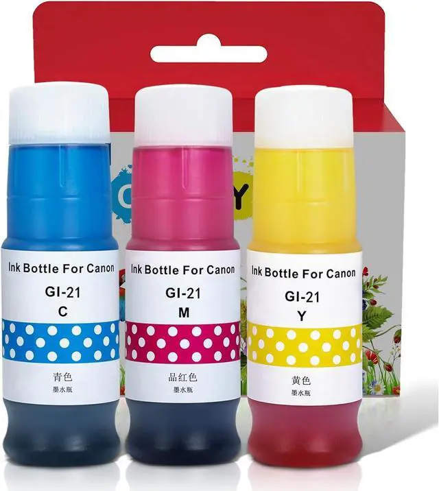 Package include: 3x compatible for Canon GI-21 70ml ink bottles ( 1*Cyan, 1* Magenta, 1* Yellow ). Not Sublimation Ink