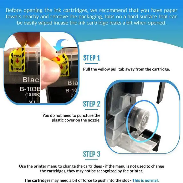 Next page of related Sponsored ProductsPage 11Page 1 Of 1SponsoredPrevious pageNext page Shop All Shop All Shop All Shop All Cost-Effective compatible brother lc103xl ink cartridges combo pack tanks 1. Remove the PULL tape 2.Install into the printer Do not need remove the transparent film. Do not need remove the transparent film. Compatible Printers Preciseness is key for accurate printing. Our ink cartridges will deliver crisp and sharp text, leaving you with prints free of bleeding and smearing. Print More Pages, Pay Less Money Vivid Color, High Performance Results Safe Single