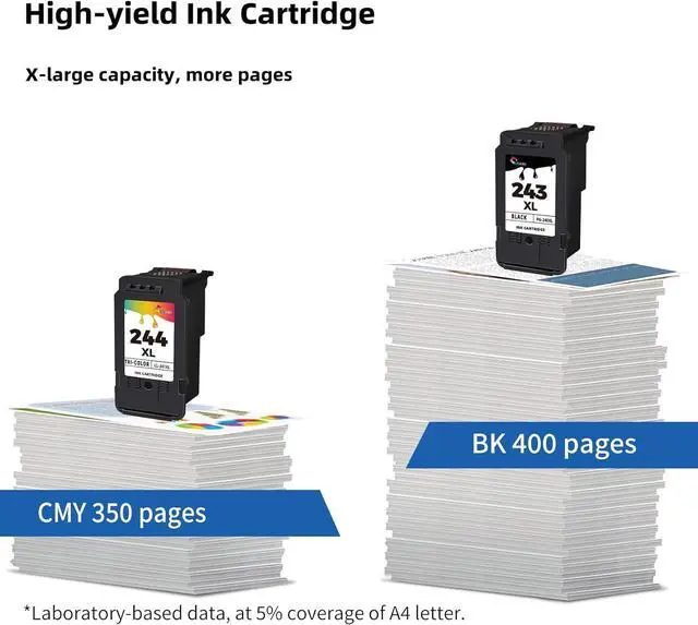 High Page Yield Ink Cartridg:400 Pages per 243xl black ink cartridge, 350 Pages per 244xl color ink cartridge at 5% coverage.