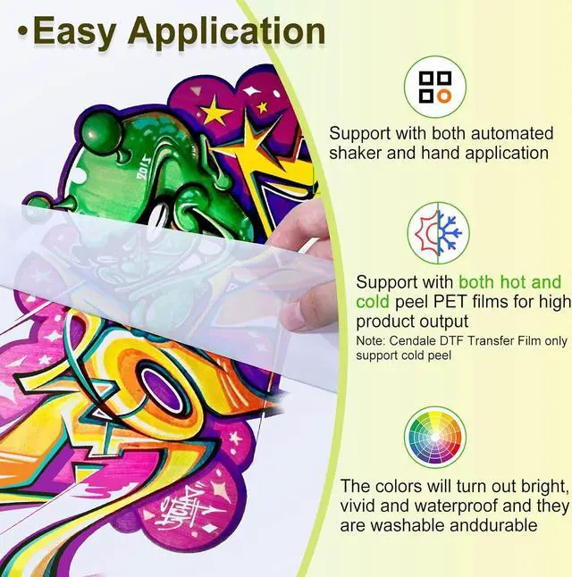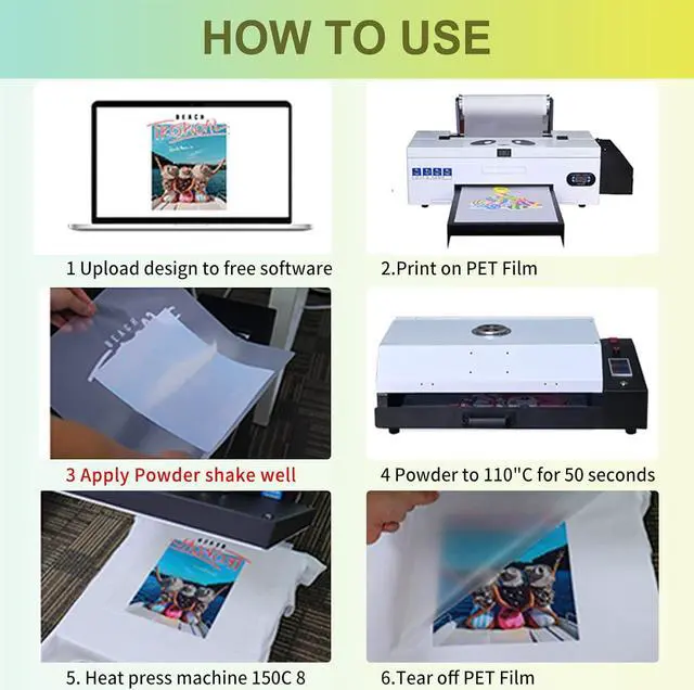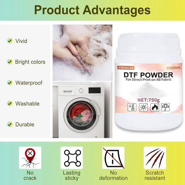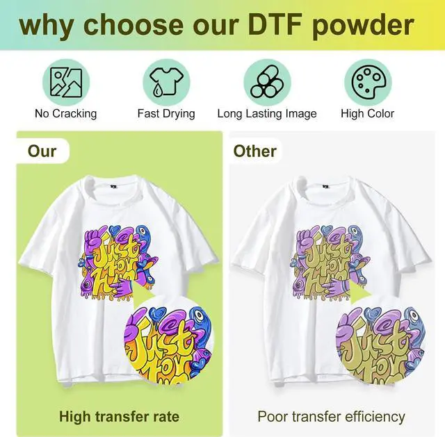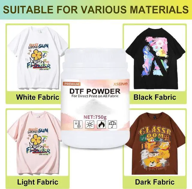Wide ApplicationDTF powder white digital transfer hot melt adhesive is suitable for all fabrics including non-treated cotton, silk, polyester, denim, nylon, leather, blends, & more. Works with all DTF & DTG printers on the market and any PET film size. Wide CompatibilityDTF Powder Compatible with DTF & DTG & All 6 and 8 color Epson printers can be converted to DTF on the market. DTG DTF printer L1800 F2100 ET4700 XP15000 Printers. Premium QualityOur DTF transfer powder will stick to the ink and not the film and won't clog your automatic shaker with excellent bonding, Waterproof and flexibilityHigh Durability.This DTF hot melt powder is 80-170um. Easy StorageDTF powder is stored in a high-quality plastic bucket, which will not be damaged and spilled, and is easy to take out and store. At the same time, the size of the container barrel is suitable for adults. Store unused white DTF powder adhesive in a cool, dry place. Great Service Our white DTF transfer powder has been tested strictly to ensure higher quality. If you are not satisfied with our DTF transfer powder, please feel free to contact us, we will give you a full refund.
