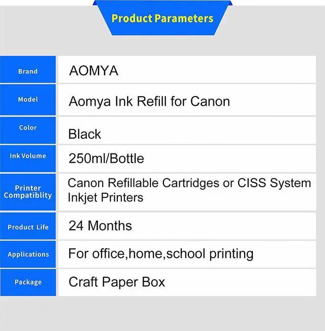 Aomya offers high quality inkjet ink for desktop printers. Widely use for remanufactured ink cartridge or the CIS/CISS system compatible with Canon inkjet printer refillable ink cartridge or CIS/CISS s.