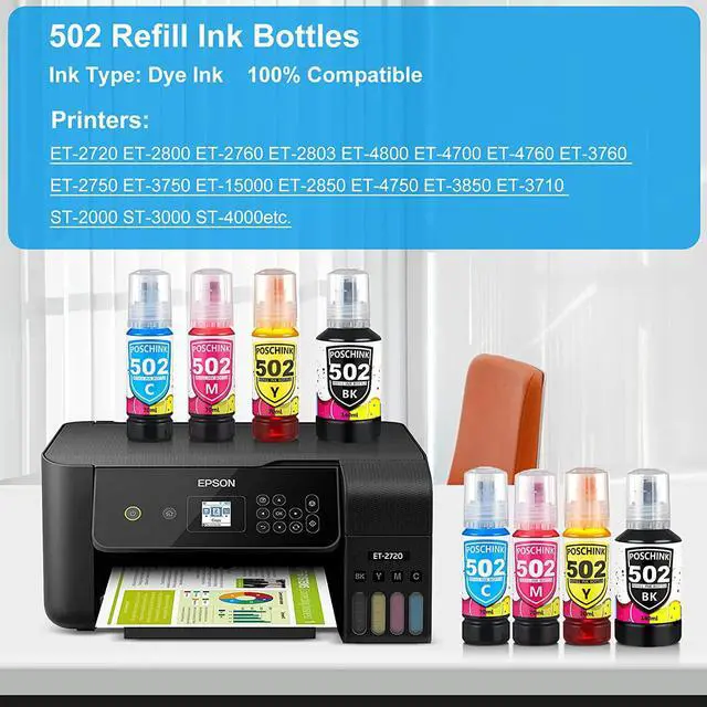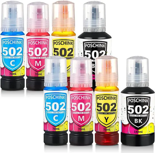 Poschink 502 T502 Ink Bottles Refill for Ecotank ET-2760 ET-15000 ET-2850 ET-4760 ET-3760 ET-2750 ET-3750 ET-3850 ET-4850 ET-3830 ET-3700 etc. Printers, Black Cyan Magenta Yellow, 8-bottle combo pack