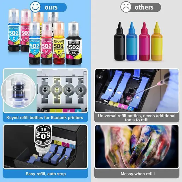 Easy Fill Bottles: The 502 ink bottle is auto-stop designed, no spill, easy fill, and stay chill. Refill your Ecotank&Supertank printers easily. This works as the OEM does.
