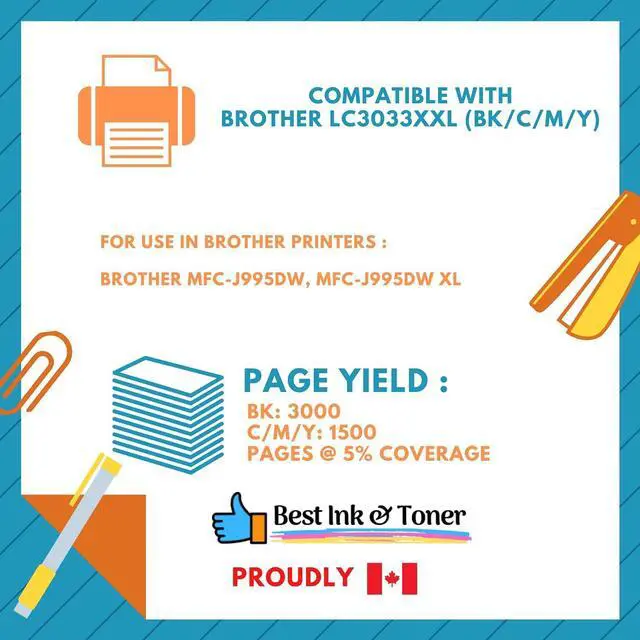 Compatible Printers: Brother MFC-J995DW, MFC-J995DW XL, MFC-J805DW AND PAGE YIELD: Black : upto 3000 Pages @ 5% coverage , Color :upto 1500 Pages @ 5% coverage