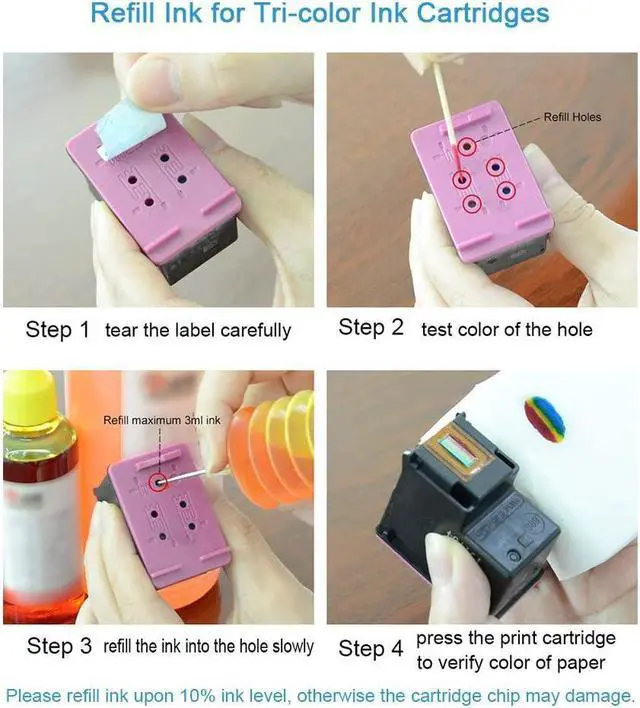 Note To ensure refill correct ink into tricolor cartridge, please use toothpick to check for the which color matches with which hole before you refill.