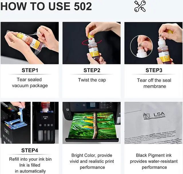 Up to 6000 pages per 502 Color ink bottle(at 5% coverage)