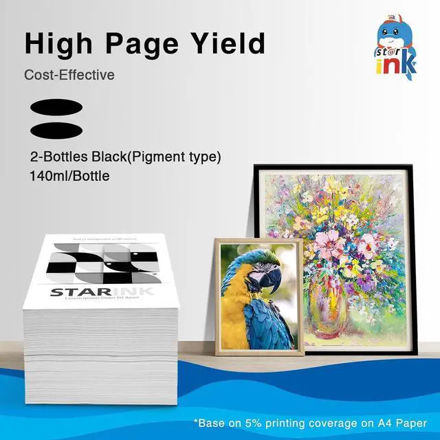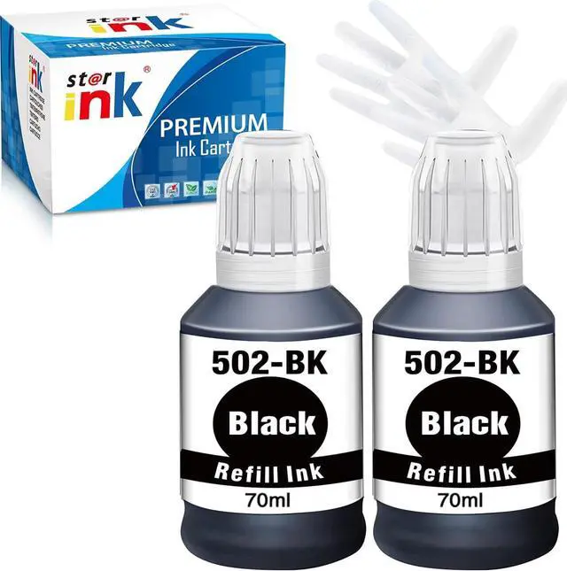 Starink compatible T502 502 black ink bottles Replacement for Epson printer. 2* 502 Black ink bottle; Volume: Pigment Black-140ml each bottle High Page Yield: Up to 7500 pages per 502 Black ink bottle; (at 5% coverage)Compatible printers: Epson ET-2760 / ET-3760 / ET-4760 / ET-2750 / ET-2850 ET-3750 / ET-3850 / ET-4750 / ET-4850 / ET-3710 ET-3830 / ET-2700 / ET-2710 / ET-2720 / ET-3700 ET-15000 / ST-2000 / ST-3000 / ST-4000 Printer