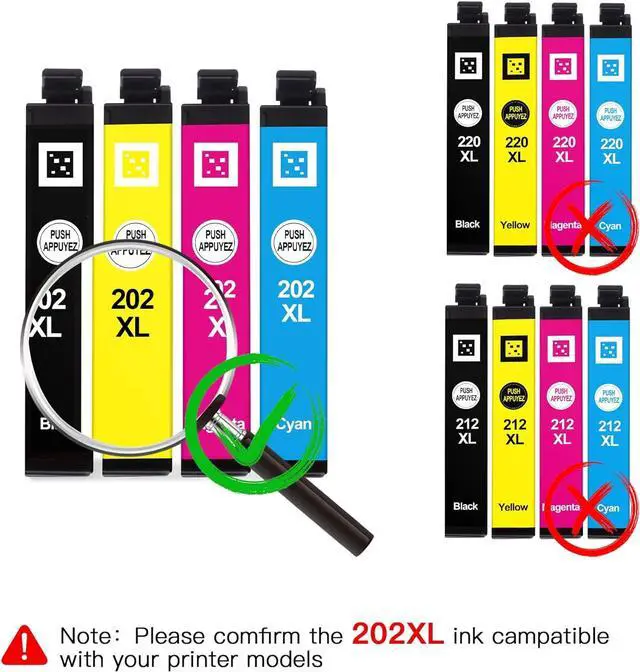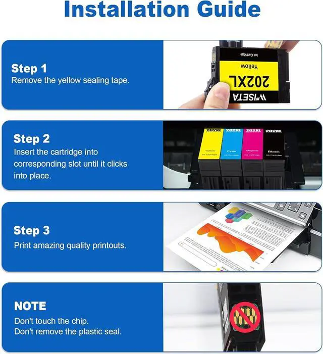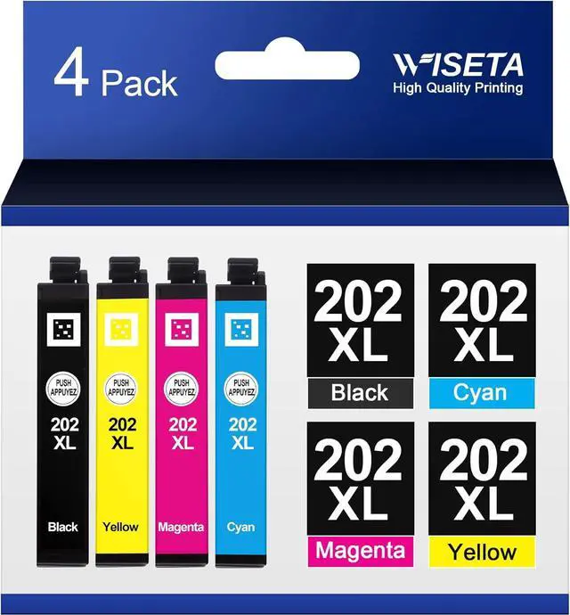 Brand: WISTA Model: Replacement for Epson Cartridges - 202 202XL 202 XL ink Cartridge SetReplacement for Epson 202 202XL 1BK/1C/1M/1Y-4 High Yield Color ink Set Includes (1) 202XL Black, (1) 202XL Cyan, (1) 202XL Magenta, (1) 202XL Yellow You can rely on WISTA Genuine ink 202 202XL because: Full range of Color:high yield ink cartridge 4 pack includes Black, Cyan, Magenta, Yellow High Yiled: 202XL black can print approximately 550 pages; 202XL Cyan, 202XL Magenta, 202XL Yellow cartridge can print 470 pages (at 5% coverage) High-Quality Printing: Superior 202 202XL ink cartridge prints out clear text and vivid images Work Seamlessly with Canon Printer 202 202XL ink is formulated as part of Pixma Series printersso this model is compatible with Epson WorkForce WF-2860, Expression Home XP-5100 All-in-One inkjet Printer