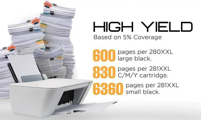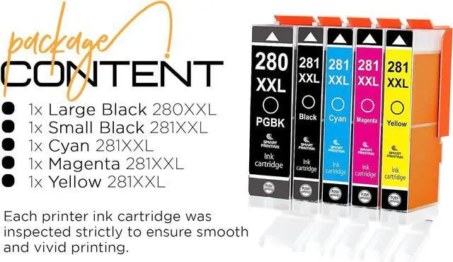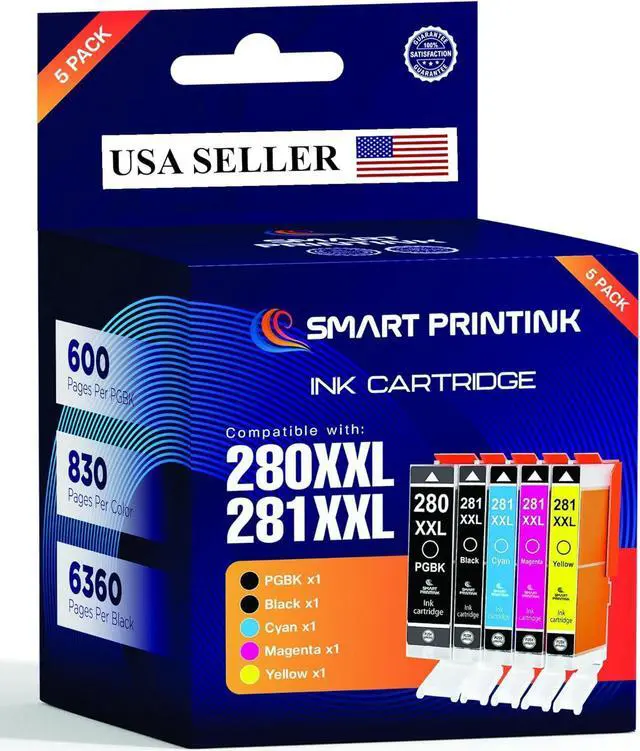 Package Contents: 1 x Large Black 280XXL, 1 x Small Black 281XXL, 1 x Cyan 281XXL, 1 x Magenta 281XXL, 1 x Yellow 281XXL (NOT Include Photo Blue, Total 5 Pack) Page Yield: PGBK (Large Black) is 600 pages per cartridge, Small Black is 6360 pages per cartridge, Color is 830 pages per cartridge "Printer Compatibility: Compatible with Canon TR8620a TR8620 TS9520 TS9521C TR8622 TR8520 TR8500 TR7620 TR7520 TR7500 TS6100 TS6120 TS6200 TS6220 TS6300 TS6320 TS702 TS702a TS8100 TS8120 TS8200 TS8220 TS8222 TS8300 TS8320 TS8320 TS8322 TS9100 TS9120 Printers"
