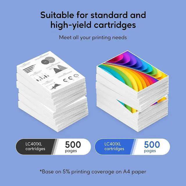 Pages Yield: Up to 500 Pages per LC401 Black XL ink cartridge, 200 Pages per LC401XL Color Standard ink cartridge
