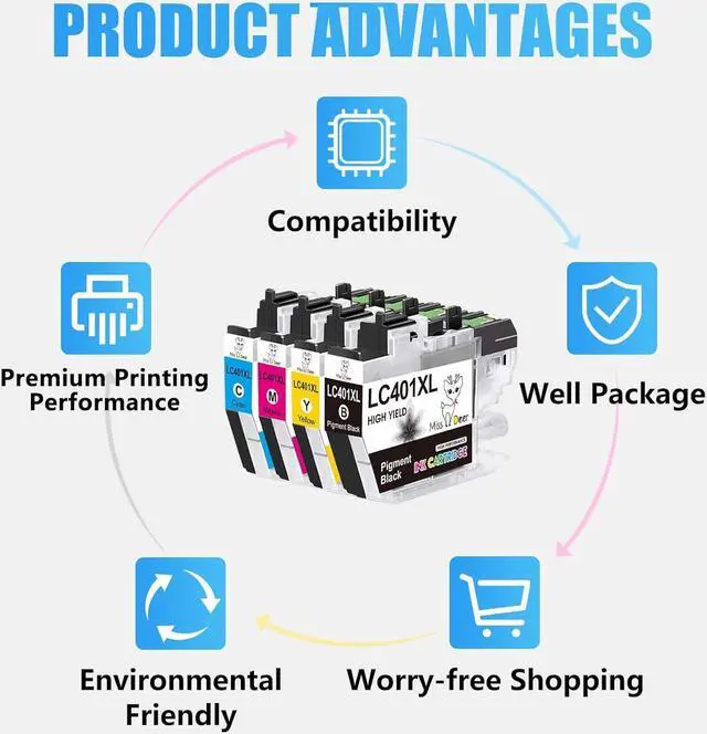 Miss Deer lc401 ink cartridges 100% compatible with: Brother inkjet all-in-one printers MFC-J1010DW, MFC-J1012DW and MFC-J1170DW.