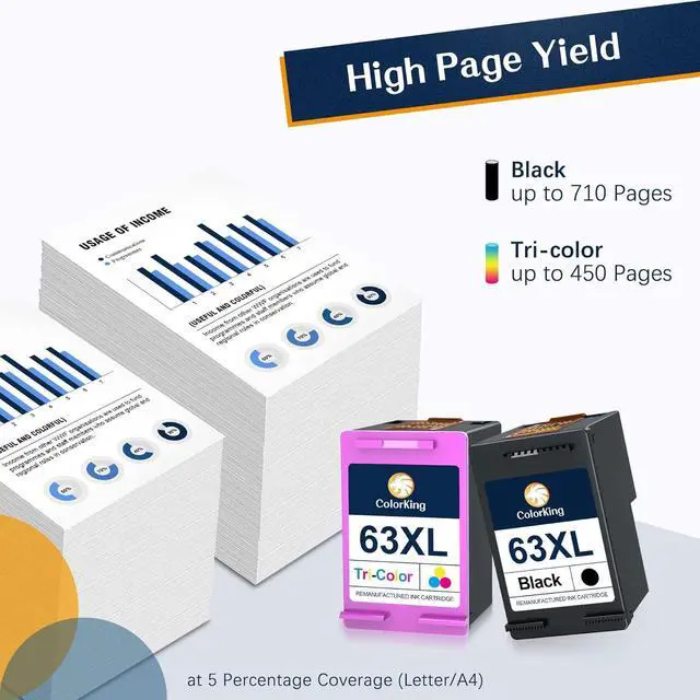 710 Pages per 63 XL 63XL Black ink cartridge, 450 Pages per 63 XL 63XL Tri-Color ink cartridge at 5 percent coverage