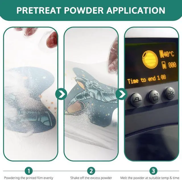 Wide Compatibility - The DTF transfer Powder works with all DTF&DTG inkjet printers, and all 6 and 8 color Epson printers can be converted to DTF on the market. Work with any PET film size.