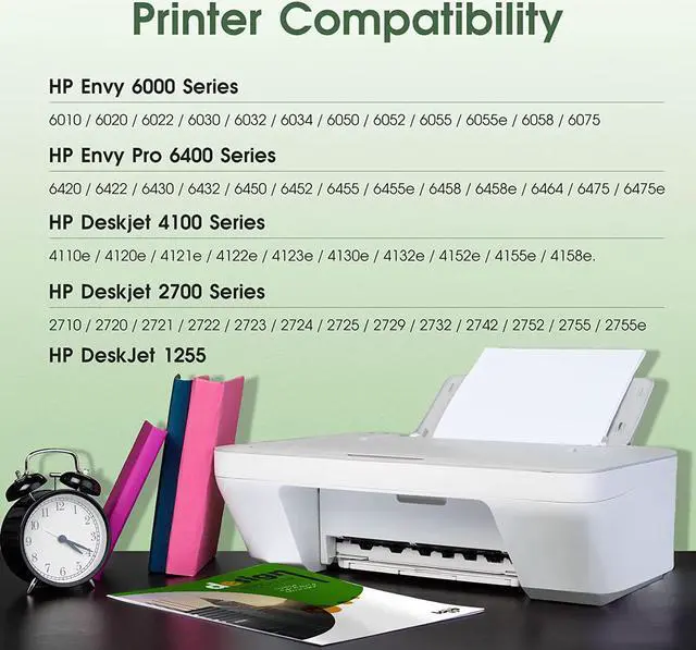 Printer Compatibility: HP DeskJet 1255 HP Envy 6000 Series: 6010 6020 6022 6030 6032 6034 6050 6052 6055 6055e 6058 6075 HP Envy Pro 6400 Series: 6420 6422 6430 6432 6450 6452 6455 6455e 6458 6458e 6464 6475 6475e HP Deskjet 4100 Series: 4110e, 4120e, 4121e, 4122e, 4123e, 4130e, 4132e, 4152e, 4155e, 4158e. HP Deskjet 2700 Series: 2710 2720 2721 2722 2723 2724 2725 2729 2732 2742 2752 2755 2755e All In One Printer