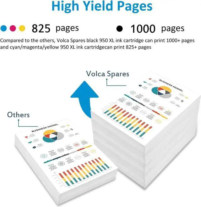 Volca Spares 950XL/951XL Ink Cartridge is a premium replacement for HP 950XL/951XL Ink Cartridge. It is compatible with HP OfficeJet Pro 251dw, 271dw, 276dw, 8100, 8110, 8600, 8610, 8615, 8620, 8625, 8630, 8640, 8660 etc series printers. Volca Spares ink cartridges is committed to providing more page production and more options for different needs.