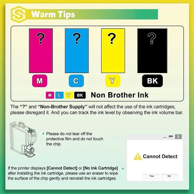 • Tips: The ? and Non-Brother Supply will not affect the use of the ink cartridges, please disregard it. And you can track the ink level by observing the ink volume bar.