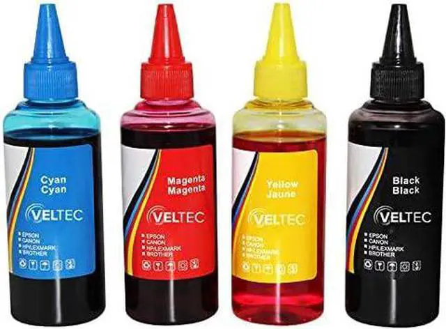 Veltec Premium Universal Refill Dye Ink for Epson, Canon, HP, Lexmark, Brother, Samsung, Dell, Kodak and Most Inkjet Printers 4 Colors (3.4 oz / 100 ml each bottle)