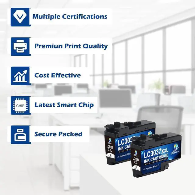 Package Contents 2BK LC3037XXL 1BK, 1C, 1M, 1Y LC3037XXL 2BK, 1C, 1M, 1Y LC3037XXL 2BK, 2C, 2M, 2Y LC3037XXL 1BK, 1C, 1M, 1Y LC3039XXLPage Yield (at 5% coverage) Black: 3,000 Black: 3,000 Color: 1,500 Black: 3,000 Color: 1,500 Black: 3,000 Color: 1,500 Black: 6,000 Color: 5,000Based Ink Pigment Pigment Pigment Pigment PigmentUpgraded Chip Premiun Print Quality 5.0 out of 5 starsDOUBLE D Compatible Ink Cartridge Pigment Replacement for Brother LC3037 XXL LC3037XXL LC3037BK for MFC-J5845DW MFC-J5845DW MFC-J5945DW MFC-J6545DW MFC-J6945DW MFC-J6545DW XL (2-Pack Black)