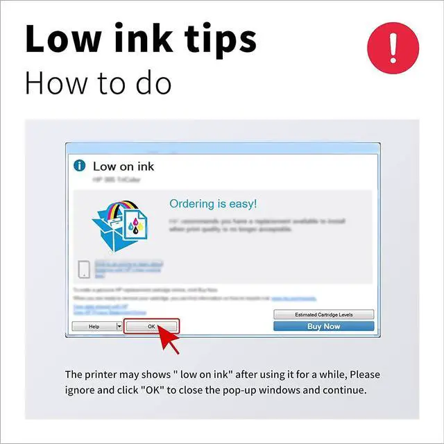 When the printer shows the indication of ""Used or refilled cartridges installed"" or ""Low on ink"", please click the ""OK"" button and continue to use up the ink in the ink cartridge until low image density.