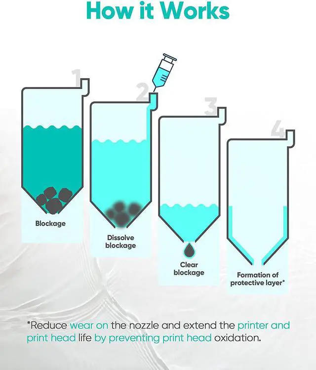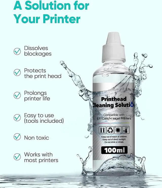 Cleaning Ability: Printer Head Cleaning Kit helps fix the problem of discoloration or poor printing result caused by clogged print head, The degradation factor can strongly dissolve the hard block and other soluble impurities left after the ink harden