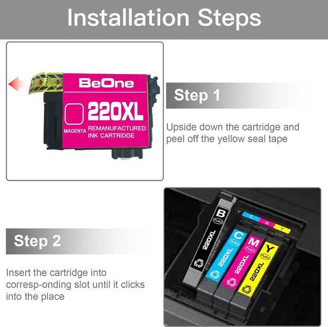 Package Include: WITH UPGRADED CHIPS 1x Remanufactured for Epson 220XL (Black) 1x Remanufactured for Epson 220XL (Cyan) 1x Remanufactured for Epson 220XL (Magenta) 1x Remanufactured for Epson 220XL (Yellow) 100% Compatible for Epson Follow Printers: WorkForce WF-2630 WorkForce WF-2650 WorkForce WF-2660 WorkForce WF-2750 WorkForce WF-2760 Expression Home XP-320 Expression Home XP-420