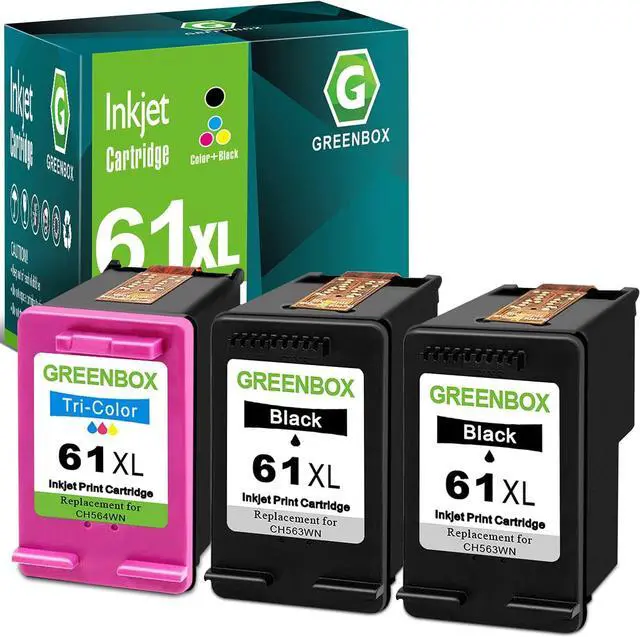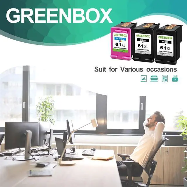 Package includes: 1 User Guide and 2 Pack (2 Black+1 Tri-color) Remanufactured HP 61 ink cartridge. COMPATIBILITY PRINTER HP Envy Series: HP Envy 4500, 4501, 4502, 4503, 4504, 4505 HP Envy 5530, 5531, 5532, 5534, 5535, 5539 HP Deskjet Series: HP Deskjet 1000, 1010, 1012, 1050, 1051, 1055 HP Deskjet 1056, 1510, 1512, 2000, 2050, 2510 HP Deskjet 2512, 2514, 2540, 2541, 2542, 2543 HP Deskjet 2544, 2545, 2546, 2547, 2548, 2549, 3000 HP Deskjet 3050, 3054, 3510, 3511, 3512, 3516 HP Deskjet 3050A 3051A 3054A 3052A 3056A HP Deskjet 2546P 2546B 2546R HP Officejet Series: HP Officejet 2620, 2621, 2622, 4630, 4632, 4634, 4635 GREENBOX ink cartridge quality for remanufactured hpink cartridge 61 61xl: 1, We use imported ink: Bright color and exorbitant fidelity 2, Strictly test Leakproofness 3, Persistence and stability 4, The use of ours ink cartridges and supplies does not void your printer's warranty. NOTE: 1, Please confirm your Printer Model before placing order. 2, Please tear the tape off before you install the ink cartridges.