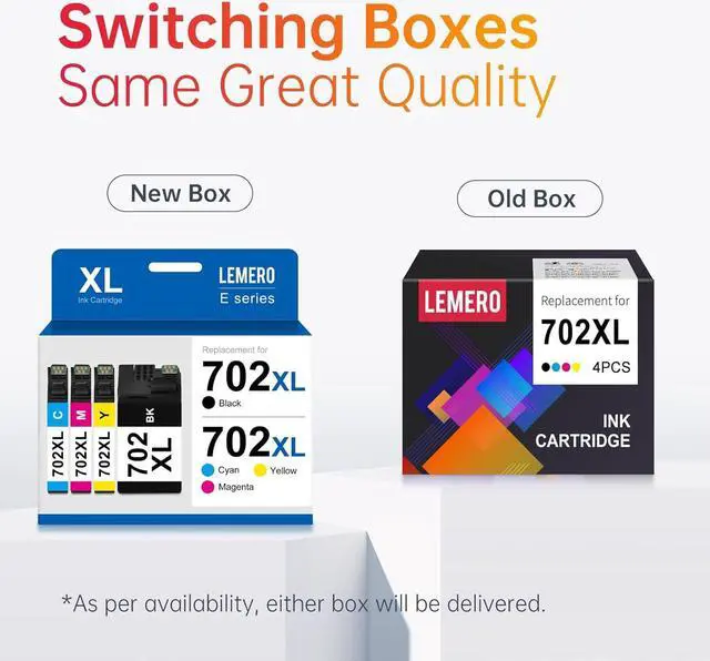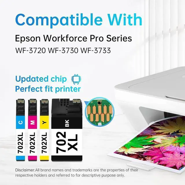 What's in the box Remanufactured ink cartridges replacement for Epson 702XL 1 Black 1 Cyan 1 Magenta 1 Yellow Compatible for Printers Epson WorkForce Pro WF-3720 WF-3730 WF-3733