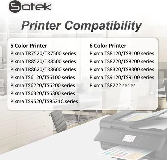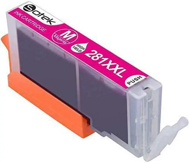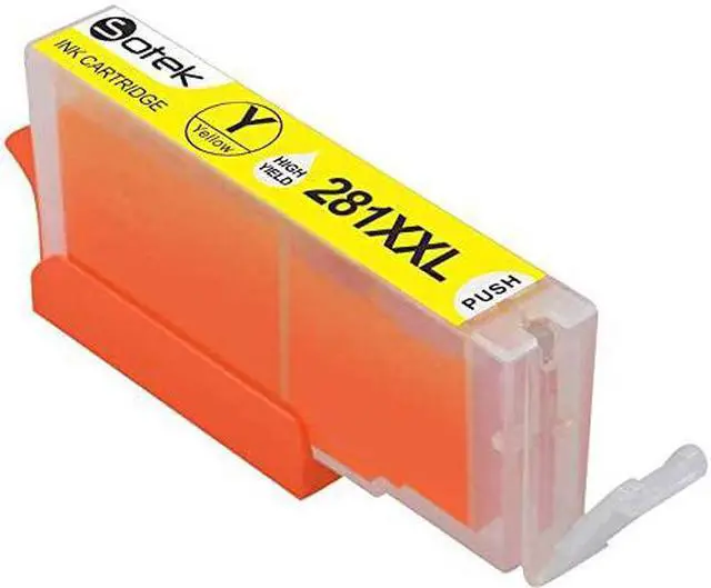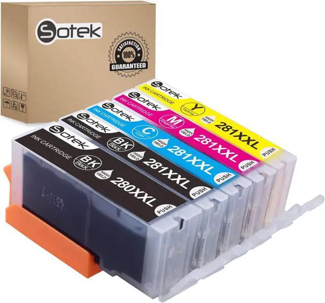 Model: Sotek Compatible Canon 280XXL 281XXL Ink Cartridges 5 Color (Without Photo Blue)Package Includes: 1x PGI-280XXL Ink Black1x CLI-281XXL Ink Black1x CLI-281 XXL Cyan1x CLI-281XXL Magenta1x CLI-281XXL Yellow (NON-OEM) Page Yield: Approximately 600 pages per PGI-280 Ink XXL black and 6, 360 pages CLI-281 Ink XXL Black, 830 pages per CLI-281 Ink XXL Cyan, Magenta, Yellow, at 5% coverage Use for: Canon Pixma TR7520, Pixma TR8520, Pixma TS6120, Pixma TS8120, Pixma TS9120 , Pixma TS702 Inkjet Printer. Use Instructions: 1. Please remove the orange cover carefully before installation with some tissue in your hand in case of leakage. 2. Please install the cartridge into the correct slot. 3. If line or blurry happens, try realigning your printer heads, choose your printer clean option to clean the print head. 4. If your printer does not recognize the ink cartridge upon installation, please take it off and install again. How to Contact Sotek? 1. Before ordering, please select "Sotek" below the Price, then click Ask a question to contact us for any question. 2. log in your Buyer Account > Click Your Account > Your Orders > If there is any questions or problems for the orders, you can check your order and click Contact Seller . We will resolve your questions or problems within 24 hours.