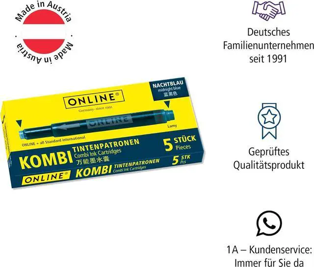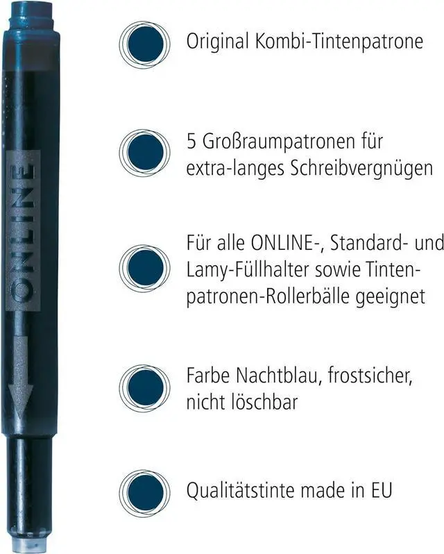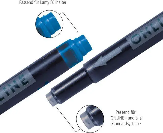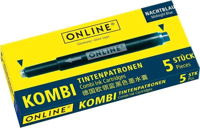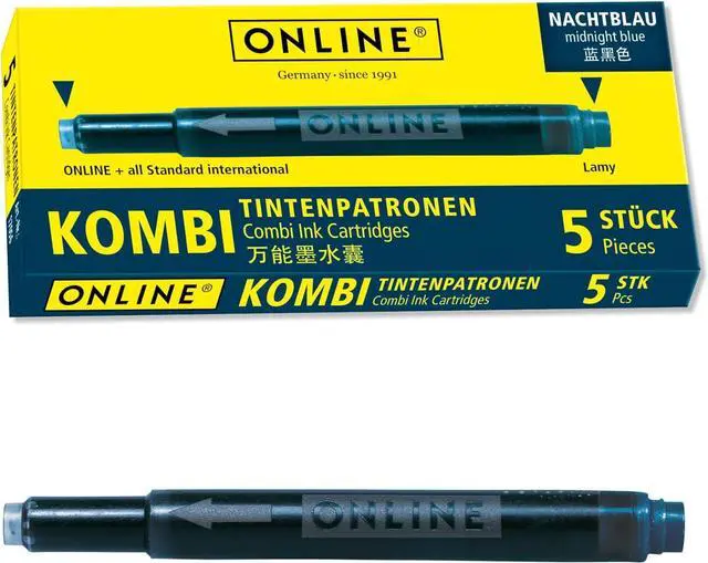 The cartridge by online the goes. In this way, the thin side for online and all other standard fountain pen systems and the thick side for Lamy cartridge pen and save time. The high quality guarantees intense colour in the same quality, in a huge range of ink colours. 1 Pack of 5 cartridges. Online writing equipment was founded in 1991 with a clean strategy as a target: the production of writing instruments with a trendy design and high quality, made in Germany, available in annual several different ranges. Still is available to buy online stayed true to these attachments. Online is now become brand for those who love special writing equipment with design and feel.