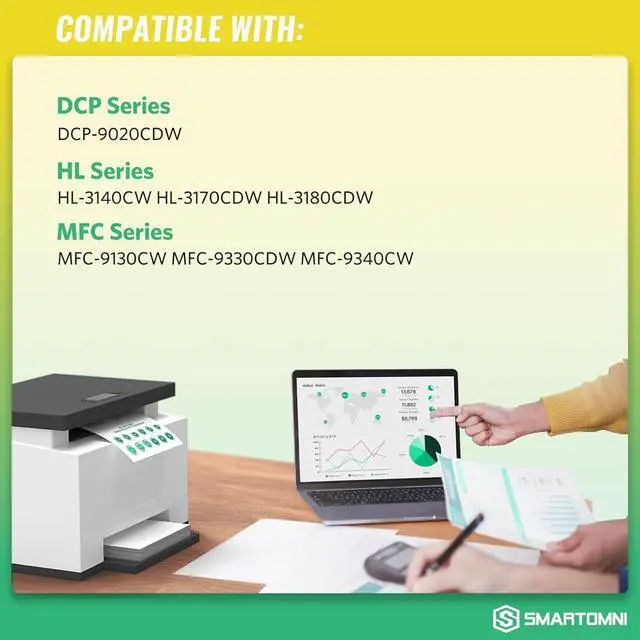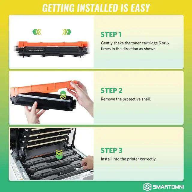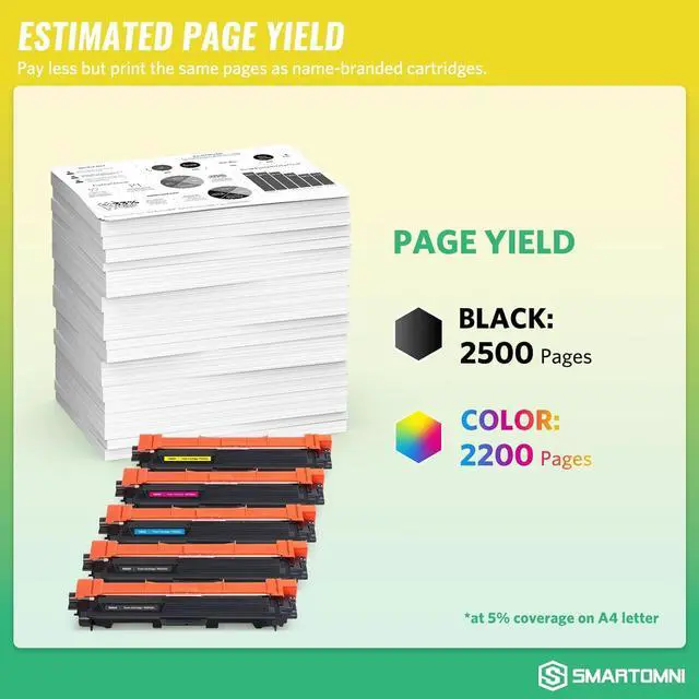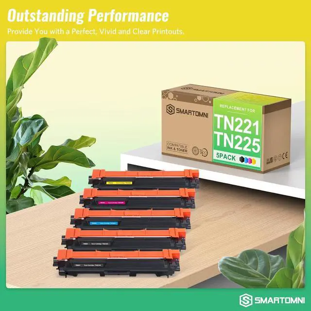 S SMARTOMNI compatible toner cartridges replacement for Brother TN221 TN225 are manufactured in an ISO 9001 & ISO14001 certified facility. All toner cartridges are engineered to produce superb results. Package Contents: 1 x User Guide, 2 x TN221 Black, 1 x TN225 Cyan, 1 x TN225 Magenta, 1 x TN225 Yellow (Total 5 Pack) Page Yield: Black is 2, 500 pages per cartridge and Color is 2, 200 Pages per cartridge at 5% coverage (USD 0. 006 / page ONLY, Save up to 70% compared to OEM toner cartridge) Compatible Printers: Brother HL-3140cw, HL-3170cdw, HL-3180CDW, MFC-9130cw, MFC-9330cdw, MFC-9340cdw, DCP-9020CDN Laser Printer. & Support: E-Z Ink toner cartridge comes with 2-Year 100% Quality / Shelf life: 24 months. Please contact Manufacturer S SMARTOMNI directly for any questions Technical support, customer support is always online for you.