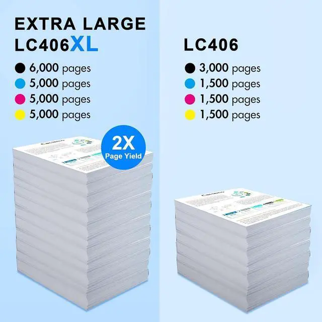 2.Extra-large CapacityUP to 6,000 pages per LC406XL LC 406XL Black Ink Cartridge (LC406XLBK) and 5,000 pages for LC406XL LC 406 XL Color Ink Cartridge LC406XLC LC406XLM LC406XLY High Yield Ink Cartridge (A4 Letter, at 5% Coverage)