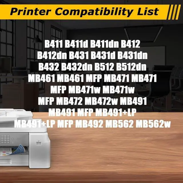 The kits are compatible with B411, B411d, B411dn, B412, B412dn, B431, B431d, B431dn, B432, B432dn, B512, B512dn, MB461, MB461 MFP, MB471, MB471 MFP, MB471w, MB471w MFP, MB472, MB472w, MB491, MB491 MFP, MB491+LP, MB491+LP MFP, MB492, MB562, and MB562w printers.