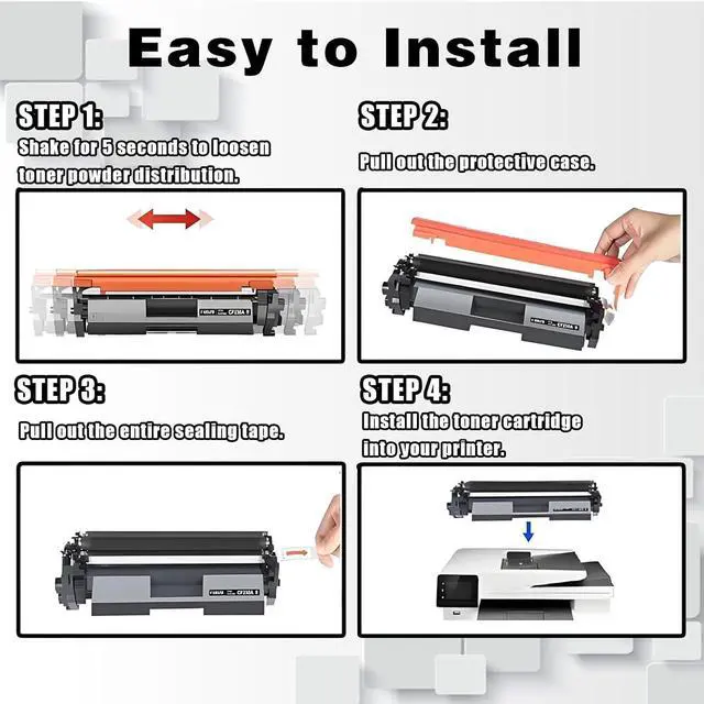 Effortless InstallationThe toner cartridges boast a straightforward installation process, unpack and install for a seamless experience