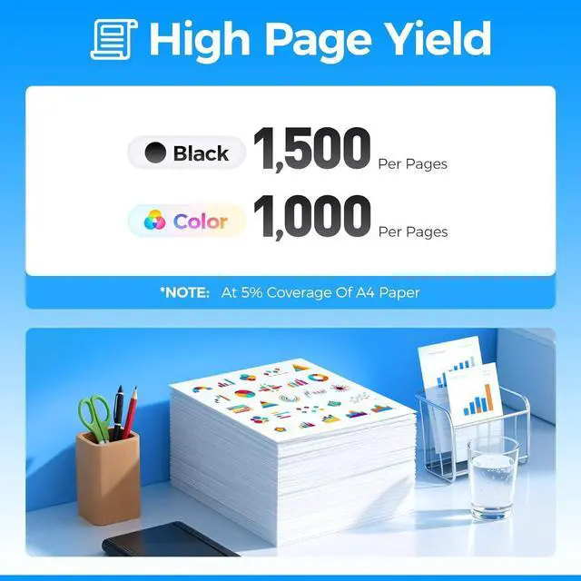 High Output: Up to 1500 pages per Black toner cartridge & 1000 Pages per Color toner cartridge at 5% coverage