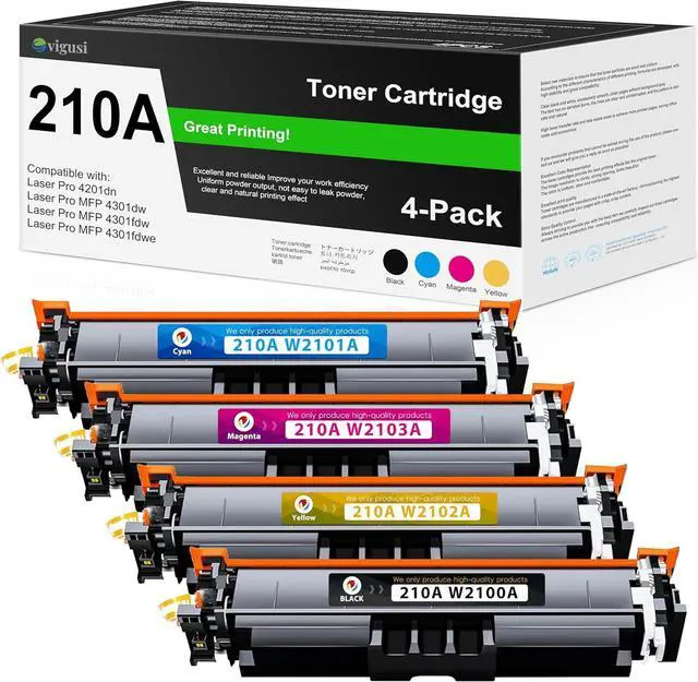 Included: 210A toner cartridges 4 pack (1 x W2100A black toner, 1 x W2101A cyan toner, 1 x W2102A yellow toner, 1 x W2103A magenta toner)