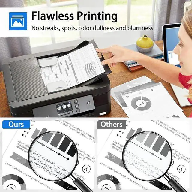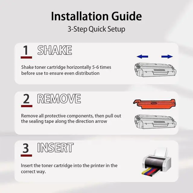 Why Choose Us: Our toner cartridges are equipped with the latest chips for quick recognition and easy installation, using high quality toner with fine particles and low scrap rate, printing bright colors and rich blacks, bringing you reliable printing results