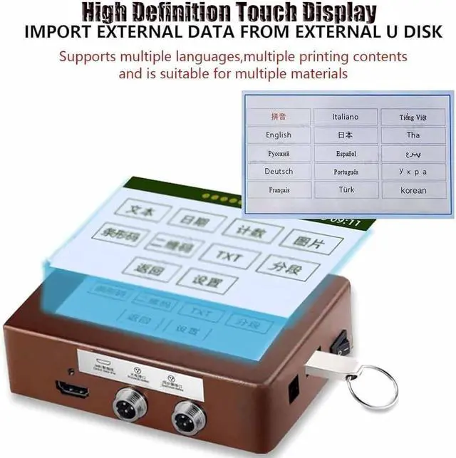 INTELLIGENT TOUCH SCREENThe industrial inkjet printer is equipped with a 5-inch high-definition touch screen, which is convenient and easy to use, and you can easily edit the content you need online. can print at a speed of up to 50m/minute, saving time and effort. And supports multiple languages to meet the continuous needs