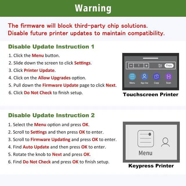Important Note Please must close the Genuine Mode before you install compatible toner cartridge with chip, the step is Setup >Supply Settings >Cartridge Supply>off. In order to avoid firmware update to block the compatible toner cartridge to be used continuously in the future, please also close the Printer Update and Firmware Update in Setup.