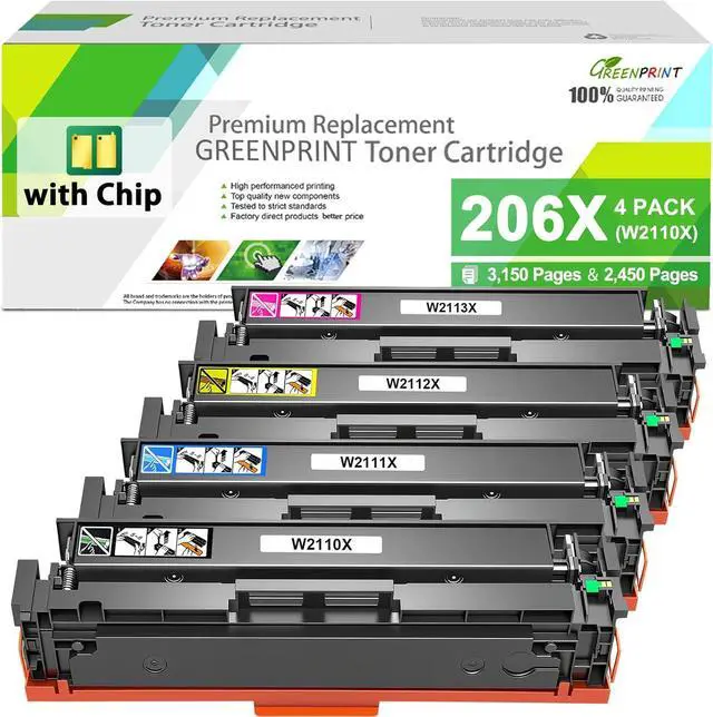 Item includedGREENPRINT Compatible Toner Cartridges 206X ( 206A ) WITH CHIP 4 Colors Set. These cartridges can be used for replacing original 206X 206A W2110X W2110A W2111X W2111A W2112X W2112A W2113X W2113A toner cartridges.