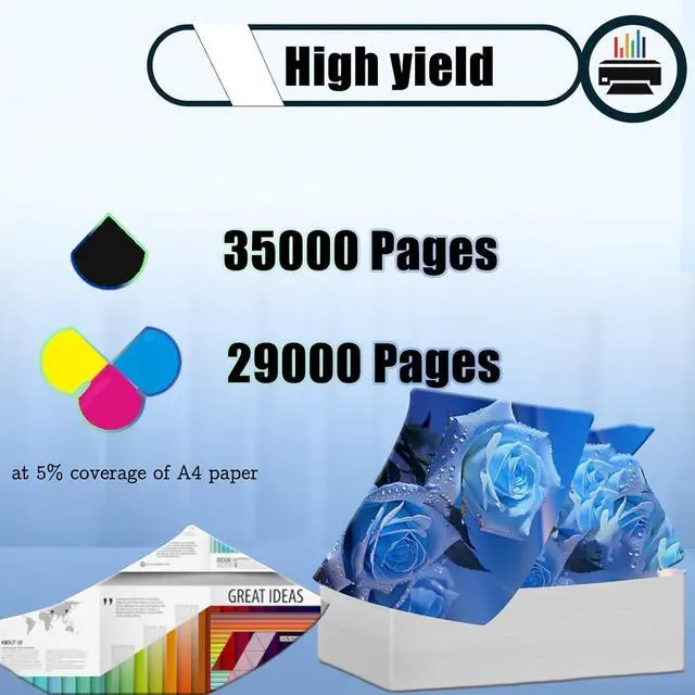 High Capacity: Our products are designed to print more pages, with large capacities that reduce the frequency of replacement; Black (BK/K) Print Pages: 35000 pages; Color (C/M/Y) print pages: 29000 Pages (5% coverage on A4 paper)