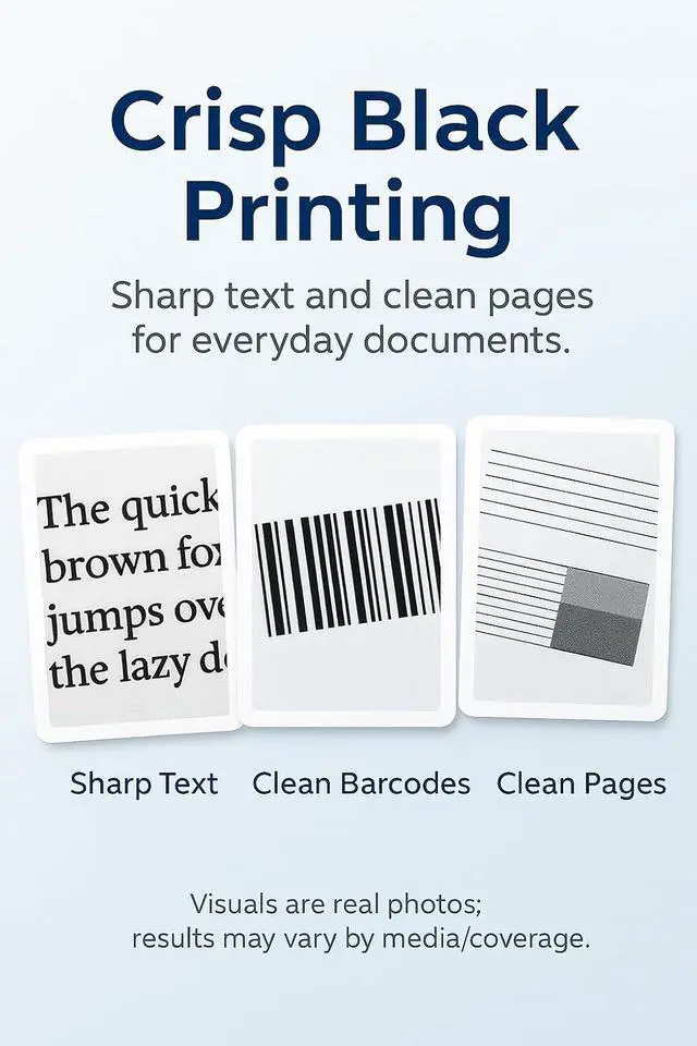 Crisp Black Text: Dense black output for sharp text and barcodes; consistent quality from first page to last.