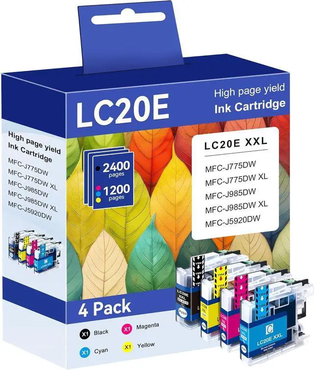 Packing ListLC20E XXL Ink Cartridges for Brother Printer contains 1 x Black lc20e xxl+1 x Cyan lc20e xxl+1 x Magenta lc20e xxl+1 x Yellow lc20e xxl (4 cartridges in total)