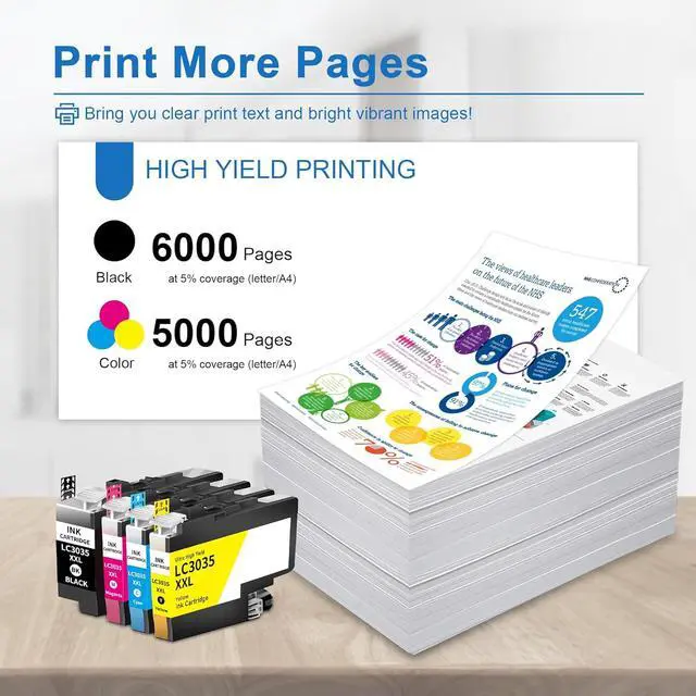 High Page Yield: Achieves up to 6000 pages for LC3035XXL black ink cartridge, 5000 pages for LC3035XXL ink cartridges, at 5% coverage (Letter/A4)