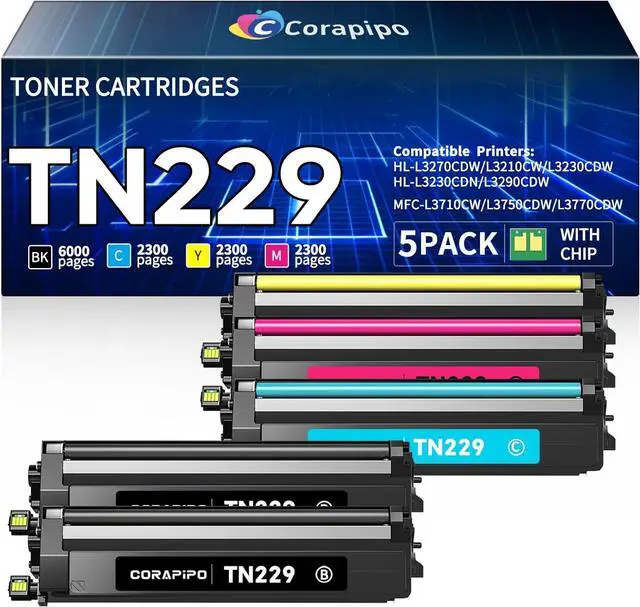 Corapipo TN229XL Toner Cartridge set includes 2 Black TN229XL Black Toner Cartridge and 3 TN-229XL(Cyan, Magenta, Yellow) Cartridgesthis 5Pack 229XL Toner Cartridge Set ensures you have all necessary colors on hand, eliminating the hassle of frequent individual replacements