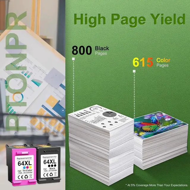 High Page Yield: Approximately 800 pages per 64XL black and 615 pages per 64XL color cartridge (Varies by specific print coverage)