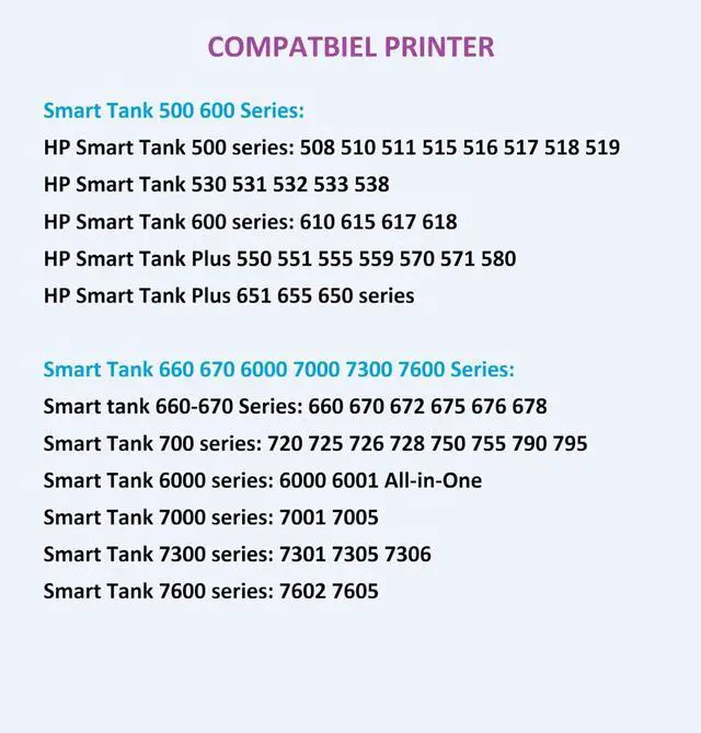 Use for HP Smart Tank Plus 550 551 555 559 570 571 580 Smart Tank Plus 650 651 655 ... Smart tank 660-670 Series: 660 670 672 675 676 678