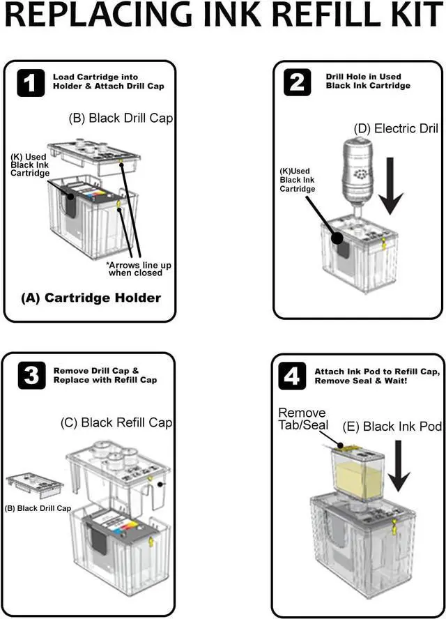 Package Contents:67XL Ink for HP ink 67XL x 3 Black, 2 Cyan, 2 Magenta, 2 Yellow Ink Tank, 1x Ink Cartridge Holder, 1x Black ink cartridge Drill Cap, 1x Tri-Color Ink Cartridge Drill Cap, 1x USB Drill, 1x Pair of Disposable gloves.