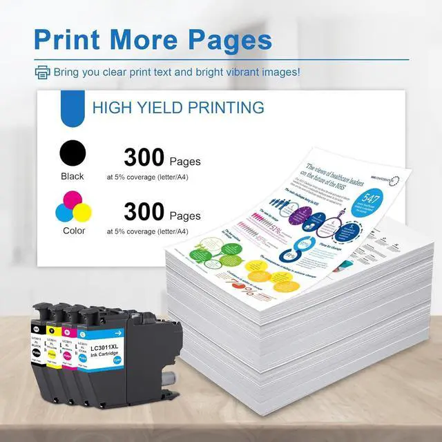 High Page Yield: Achieves up to 300 pages for LC3011XL black ink cartridge, 300 pages for LC3011XL color ink cartridges, at 5% coverage (Letter/A4)
